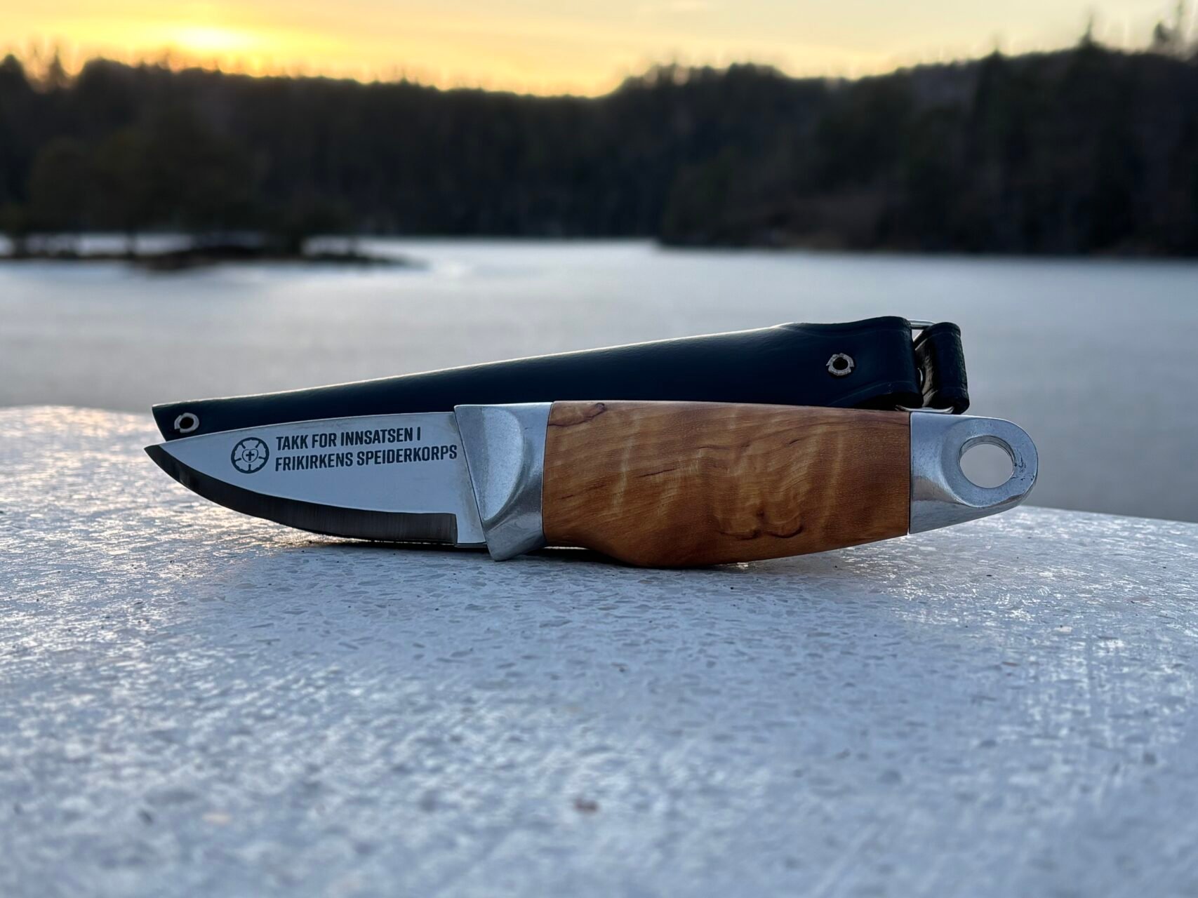 - FSK-kniven er en spesielt designet kniv i slire. Korpsmerket er preget på sliren og på knivens blad. Diplom følger med ved tildeling.